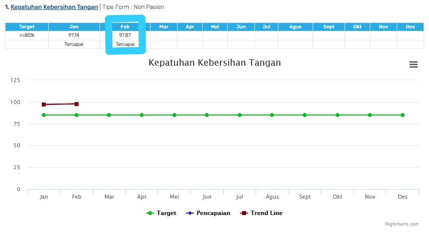 Kebersihan tangan (hand hygiene) merupakan tolok ukur dalam upaya pencegahan dan pengendalian infeksi. Berikut adalah angka kepatuhan Cuci Tangan di SMC RS Telogorejo pada tahun 2026 (Februari). Komite PPI SMC RS Telogorejo menentukan target angka kepatuhan kebersihan tangan ≧85% berdasarkan standart dari WHO.